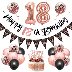 Black Rose Gold Happy 18th Birthday Party Hanging Metallic Banner Flag Cake Toppers and Number Printed Helium Balloons Decor Set