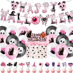 ピンクのジャック-o'-ランタンスカルゴーストキャットバット漫画バルーンケーキトッパー女の子のためのポスターバナーハロウィーンBOOパーティーの装飾用品